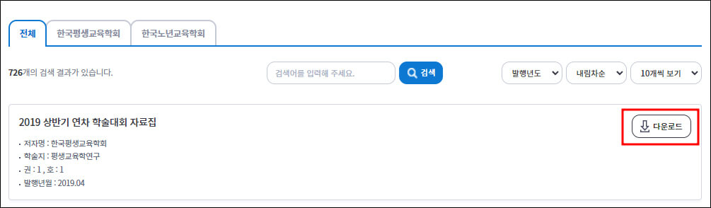 학술자료(평생교육 학술자료, RISS 학술자료), 통계자료, 정책자료가 제공됩니다. 모든 자료는 저자명, 해당 학술지, 권/호, 발행년월 정보와 함께 다운로드 서비스가 운영되고 있습니다.