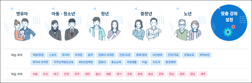 학교에 다닐 때만 학습을 해야 하는 시대는 지난 것 같습니다. 평균 연령이 상승하고 있어서 나이가 들어도 새롭게 배워야 할 것들이 많은 요즘, 평생학습 정보를 손쉽게 이용할 수 있는 사이트를 알고 계시면 도움이 될 것 같습니다.