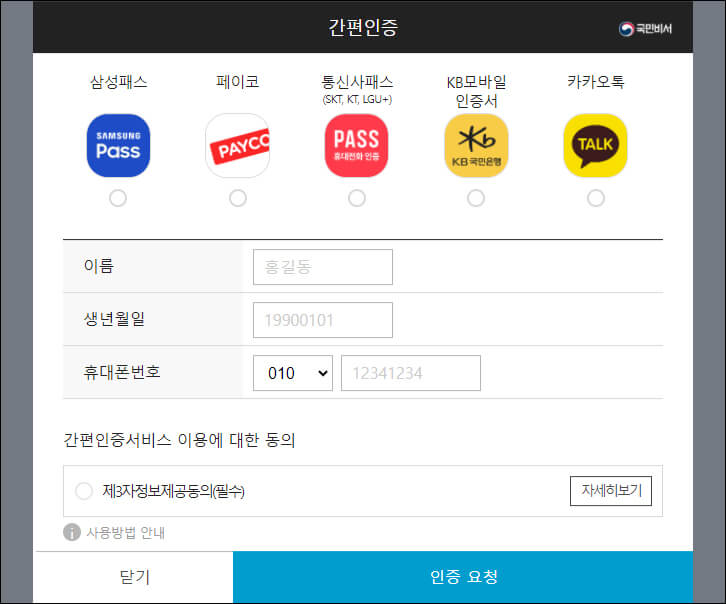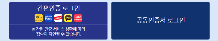 국민비서 홈페이지에서 신청하는 서비스는 인증은 간편인증과 공동인증서 로그인을 통해 할 수 있습니다.