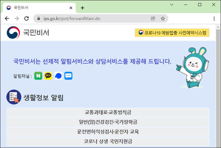 국민비서 홈페이지 서비스 제공 메뉴입니다. 코로나 19 예방접종 사전예약시스템 연결 링크가 상단에 있으며 알림 채널을 공지하고 있습니다.