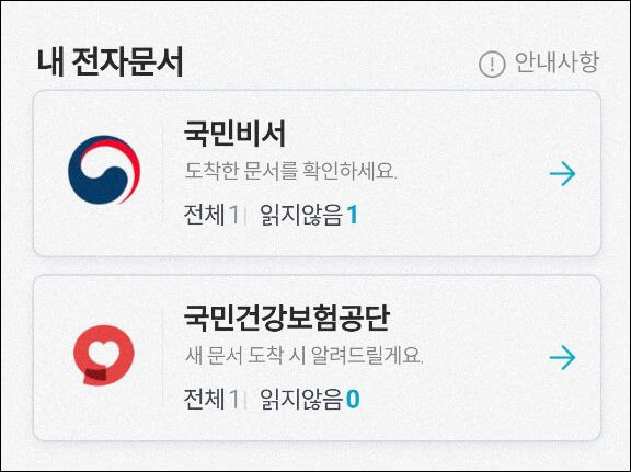 저는 네이버 앱을 국민비서에 연동해 두었습니다. 국민비서에서 알림이 오면 내 전자문서에 오게 되어 있습니다. 내 전자문서에 읽지 않은 문서가 뜹니다.