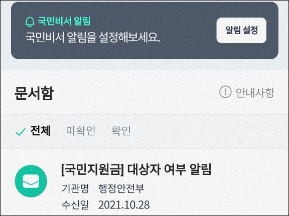 국민비서 서비스 상세 페이지에 들어가면 알림 설정 및 미확인, 확인 메시지를 모두 볼 수 있습니다.