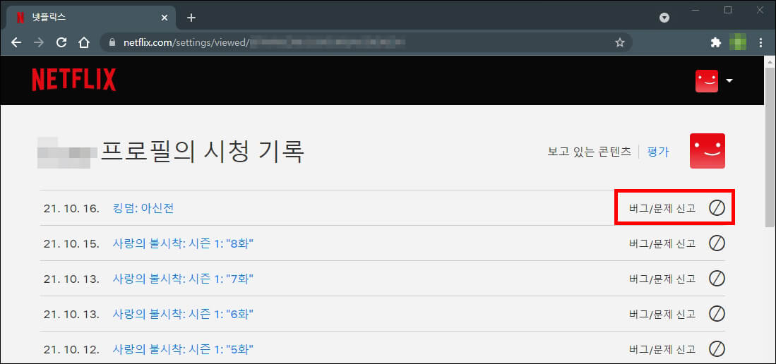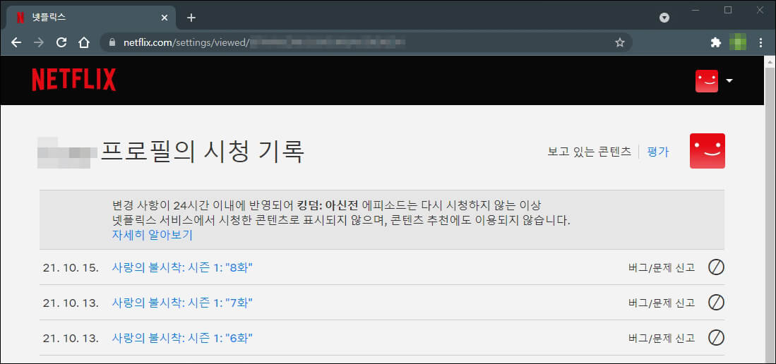 ⑤ 요즘 보고 있는 넷플릭스 시청 기록이 나옵니다. 하나씩 넷플릭스 시청 기록 삭제를 하고 싶다면 해당 목록의 오른쪽을 눌러서 지워줍니다.