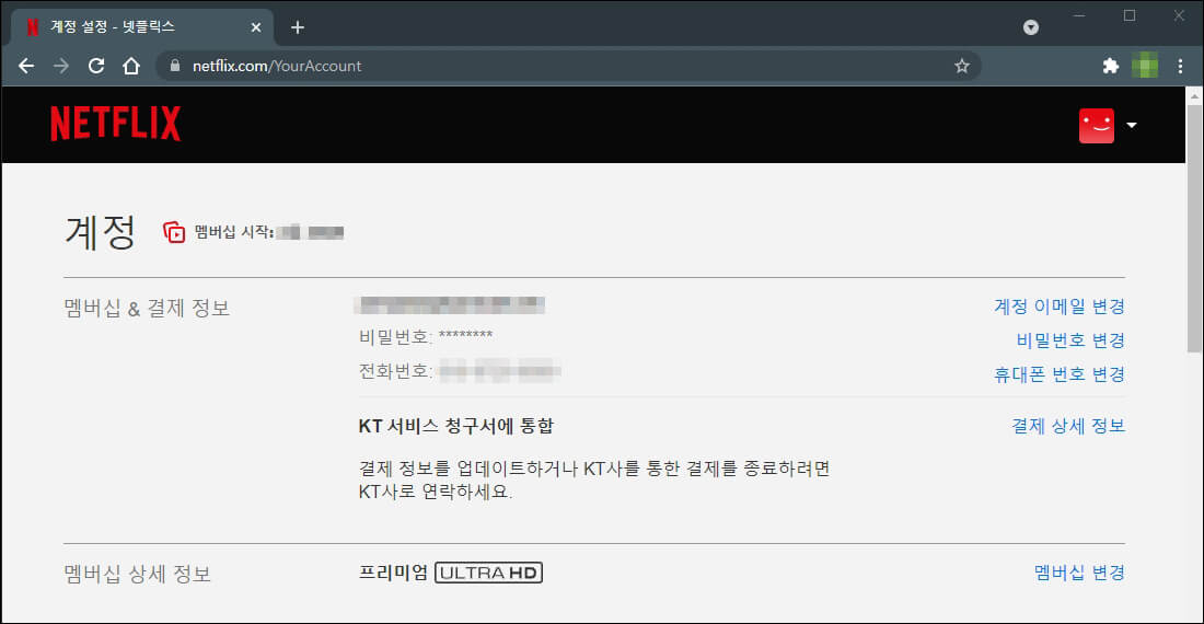 ③ 계정 메뉴에 들어가면 상단에는 멤버십 & 결제 정보가 나옵니다. 이 화면 밑으로 내려가면 해당 사용자의 개별 메뉴를 볼 수 있습니다.