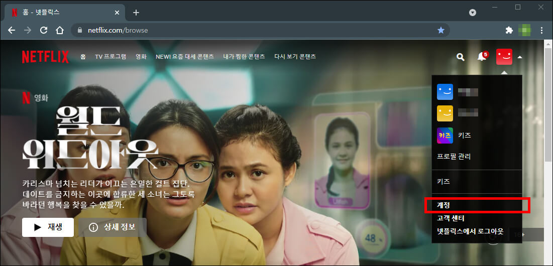 PC와 모바일 모두 같은 방법으로 진행됩니다. 저는 PC 기준으로 작성해 보겠습니다. 핸드폰으로 진행하려면 넷플릭스 앱이 아니라 크롬, 사파리 같은 웹 브라우저 프로그램으로 넷플릭스에 들어가 똑같이 따라 하면 됩니다.