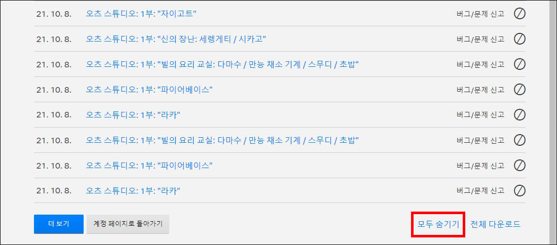 ⑥ 하나씩 삭제하는 것이 아니라 요즘에 본 전체 넷플릭스 시청 기록 삭제를 하고 싶다면 맨 밑으로 내려갑니다. 우측 하단에 있는 모두 숨기기를 선택합니다.