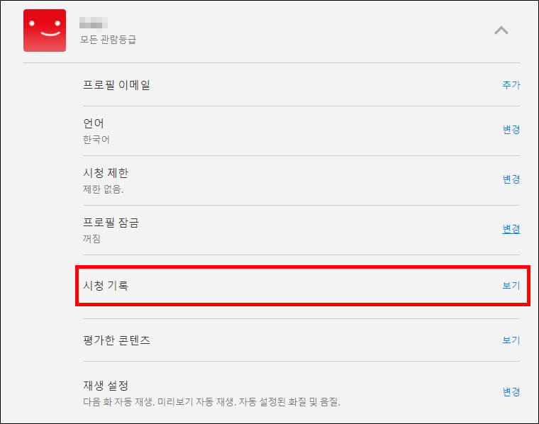 ④ 제 아이콘을 선택하면 해당 메뉴가 쭉 나옵니다. 그중 '시청 기록'을 클릭합니다.