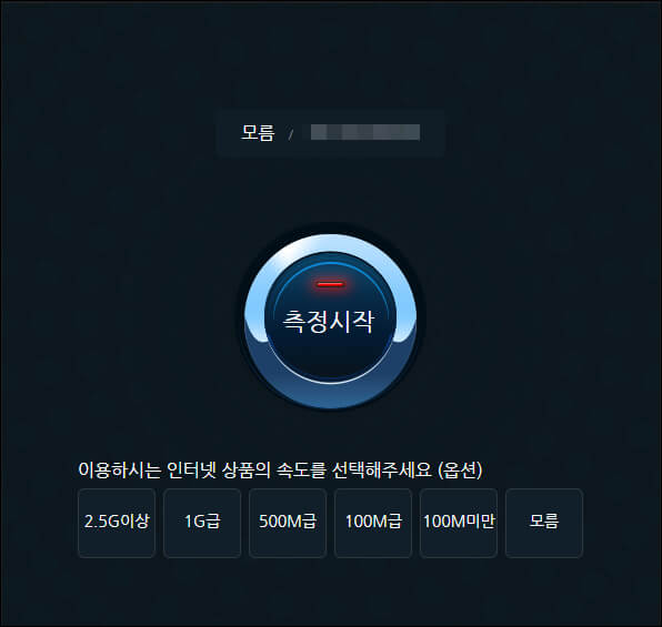 첫 페이지에 나와 있는 속도측정하기 버튼을 누르면 회원이 아니더라도 무료로 이용할 수 있습니다. 자신이 사용하는 인터넷 상품의 속도를 선택하면 되는데, 만일 정확하게 알지 못한다면 맨 우측에 있는 '모름' 버튼을 누르면 됩니다.