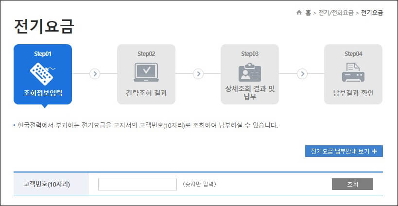 전기요금을 인터넷 지로 납부할 경우에는 고객번호 10자리로 조회해야 합니다. '조회정보 입력 > 간략조회 결과 > 상세조회 결과 및 납부 > 납부결과' 확인 순으로 이어집니다. 결제는 본인계좌, 신용카드 납부만 가능합니다.