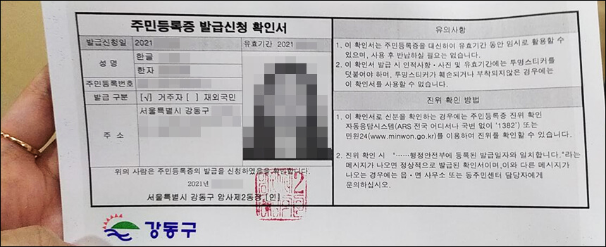 - 주민센터에서 신청한 경우 주민등록증 발급신청 확인서를 받을 수 있습니다.