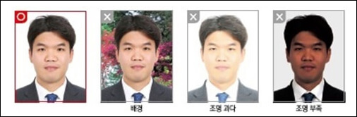 배경이 없거나, 흰색 바탕을 권장하며 옅은 단일 색 배경을 사용해야 합니다. 조명 과다나 조명 부족, 초점이 나간 사진은 본인 확인이 어려워 사용할 수 없습니다.