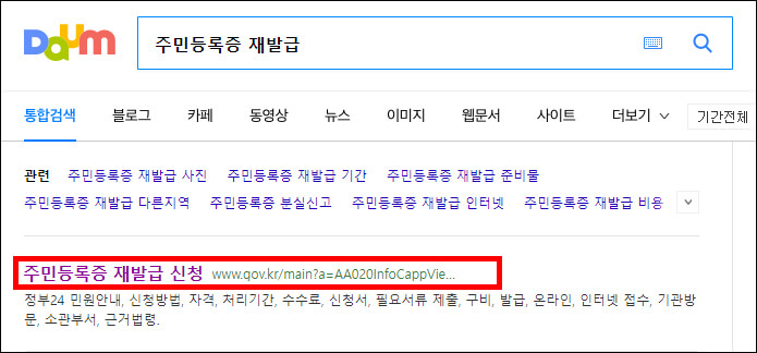 포털 사이트에서 '주민등록증 재발급'을 검색합니다. 주민등록증 재발급 신청 메뉴를 선택해 정부24 홈페이지에 접속하면 됩니다.
