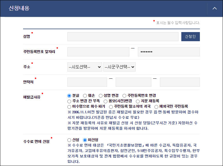 ③ 신청 내용 화면이 나오면 개인정보를 입력하고, 본인의 재발급 사유를 선택하면 됩니다. 2006년 이전에 발급된 주민등록증 재발급과 지문 재등록의 경우에는 온라인으로 접수할 수 없고 주민센터에 방문하여 접수해야 합니다. SMS로 수령 안내 메시지 서비스를 신청할 수도 있습니다.