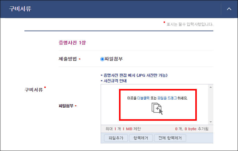 JPG 파일을 파일 첨부 영역으로 드래그하거나 더블클릭하면 됩니다.