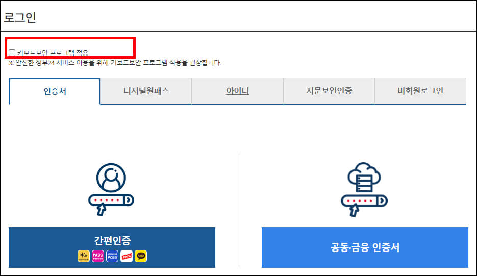 로그인할 때는 키보드 보안 프로그램을 적용하는 것이 좋습니다. 가상 키보드를 사용하면 오타가 자주 납니다.