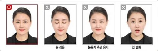 입은 다물고 자연스러운 얼굴 표정이어야 합니다. 눈을 감지 않고 눈동자는 정면을 응시해야 합니다.
