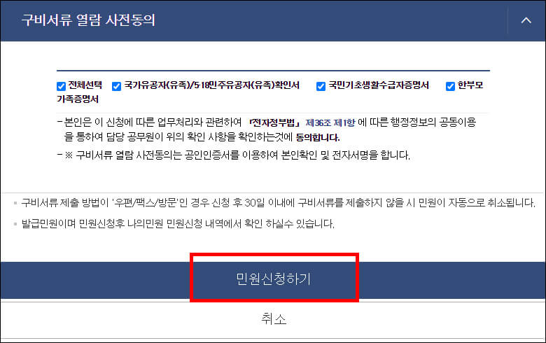 구비서류 열람 사전동의는 담당 공무원이 해당 사항이 있는 경우 관련 서류를 확인하기 위하여 받는다고 합니다. 하단의 민원신청하기 버튼을 누르면 온라인으로 주민등록증 재발급 신청 자체는 완료됩니다.