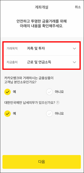 개인정보를 확인하고 영문 이름, 집 주소를 입력합니다. 거래 목적, 자금출처를 선택하고, 카카오뱅크 입출금통장 상품설명서 약관에 동의합니다.