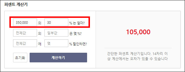 연말을 맞아 제가 사려고 하는 35만 원짜리 오리털 점퍼가 30% 할인을 한다고 가정해 보겠습니다. 30%를 계산해보니 105,000원이 나옵니다. 이렇게 할인받는 금액을 계산하고 싶을 때는 퍼센트 계산기의 첫 번째 옵션을 이용하면 됩니다.