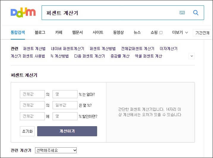 다음 포털에서 '퍼센트 계산기'를 검색하면 다음과 같은 화면이 나옵니다.