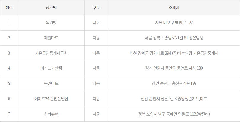 984회 로또 당첨 번호 1등이 나온 판매점 명단입니다. 7개 모두 자동 선택이 당첨되었습니다. 서울 2명, 인천과 경기, 강원, 순천, 포항에서 1명씩 행운의 주인공이 나왔습니다.