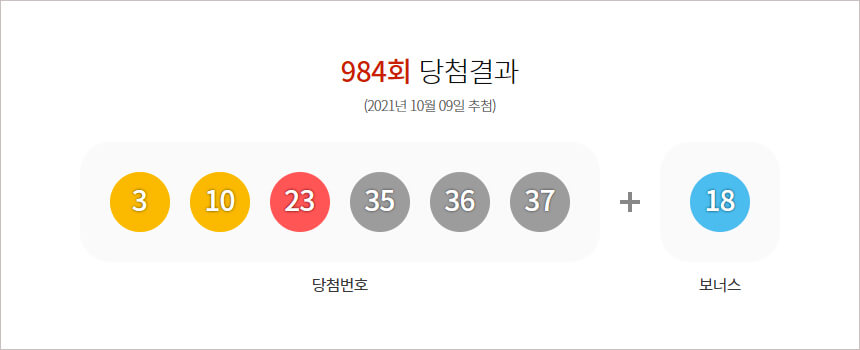 2021년 10월 09일에 추첨한 984회 로또 당첨 번호 결과는 다음과 같습니다.