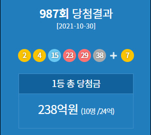 984회(2021년 10월 09일)~ 989회(2021년 11월 13일)까지 당첨된 결과입니다. 날짜가 지나서 확인을 못하신 분들은 아래 이미지들을 참고하시기 바랍니다.