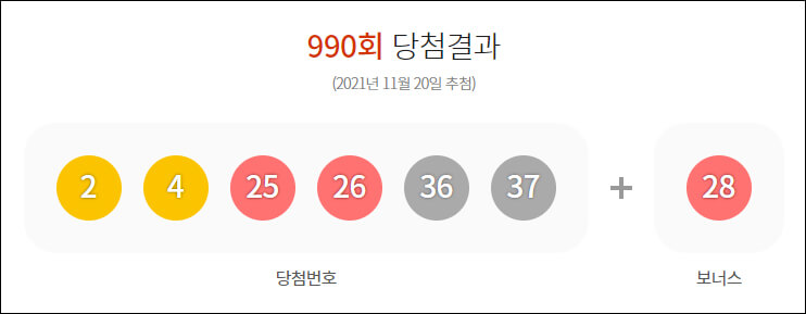 2021년 11월 20일에 추첨한 990회 로또 당첨 번호 결과는 다음과 같습니다.