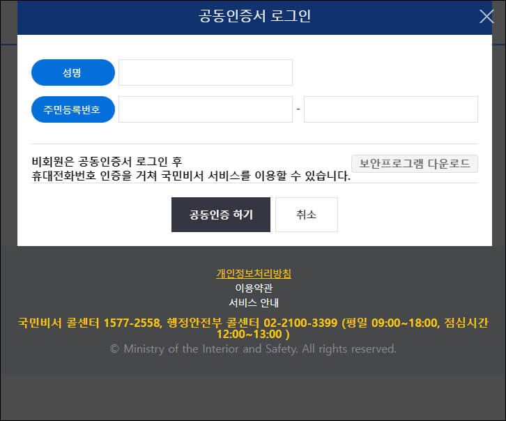 국민비서 홈페이지에서 신청하는 서비스는 인증은 간편인증과 공동인증서 로그인을 통해 할 수 있습니다.