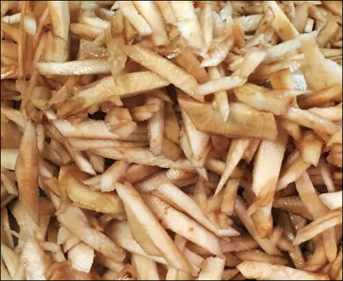 우엉을 썰 때는 최대한 얇게 써는데, 거친 섬유소질을 연하게 만들려면 연필 깎듯이 하면 됩니다. 신문지 위에 우엉을 깔고 1~2일 정도 햇볕에 바짝 말립니다.