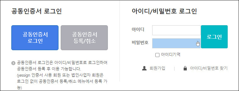 공동인증서를 등록하면 간단하게 회원 가입을 할 수 있습니다. yassign 인증서를 사용하고 있는 분은 '공동인증서 로그인' 대신 '공동인증서 등록/취소' 메뉴를 이용해 등록해야 합니다.