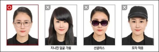 안경은 착용할 수 있지만 색안경을 쓰거나(시각장애인 제외) 안경 렌즈에 조명이 반사되면 안 됩니다. 대부분의 경우 조명이 반사되어 안경을 착용한 사진은 제출하지 않는 것 같습니다. 모자를 쓰거나 안대, 붕대, 반창고를 붙이는 것도 안 됩니다.